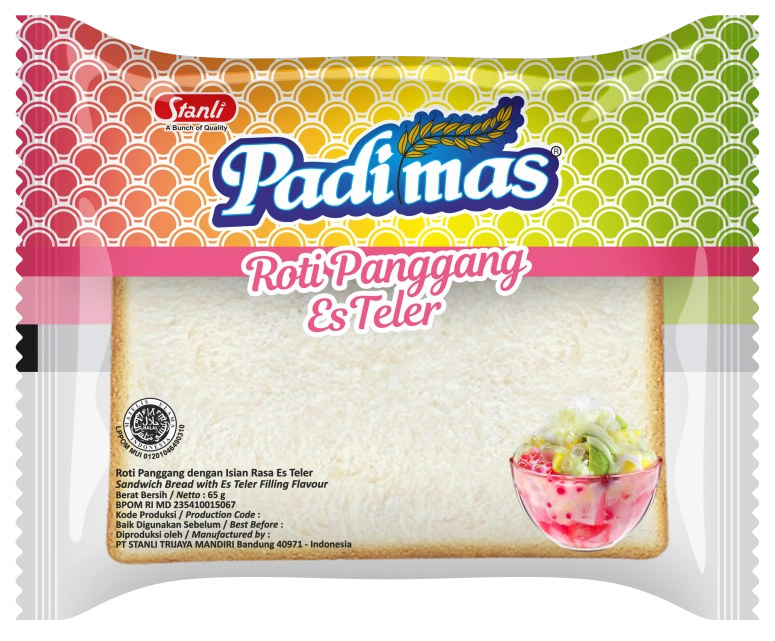 Contemporary bread that is packaged in an attractive way and affordable price. PADIMAS Roti Panggang as a practical sandwich available with Chocolate jam, Vanilla Milk, Pandan Sarikaya, Mix Fruits, Cheese, Blueberry, Choco Banana & Es Teler. Produced using the best selected recipes and assorted raw materials supported by high-tech production machine tools and of course in accordance with the standards of the National Food and Drug Aaency of the Republic of Indonesia (BPOM RI).